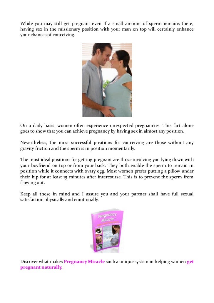 You can, of course, get pregnant having intercourse in almost any position, but there are certain gravity-defying positions such as sitting, standing, or woman on top that may discourage sperm from And "when people are trying to get pregnant, it can take the fun and spontaneity out of sex." Now you've planning to get pregnant but not able to conceive ? Positions to get pregnant may include: Man on top, woman on bottom position (aka "Missionary Position"). Can Lying Down After Sex Boost Your Chances of Conceiving?